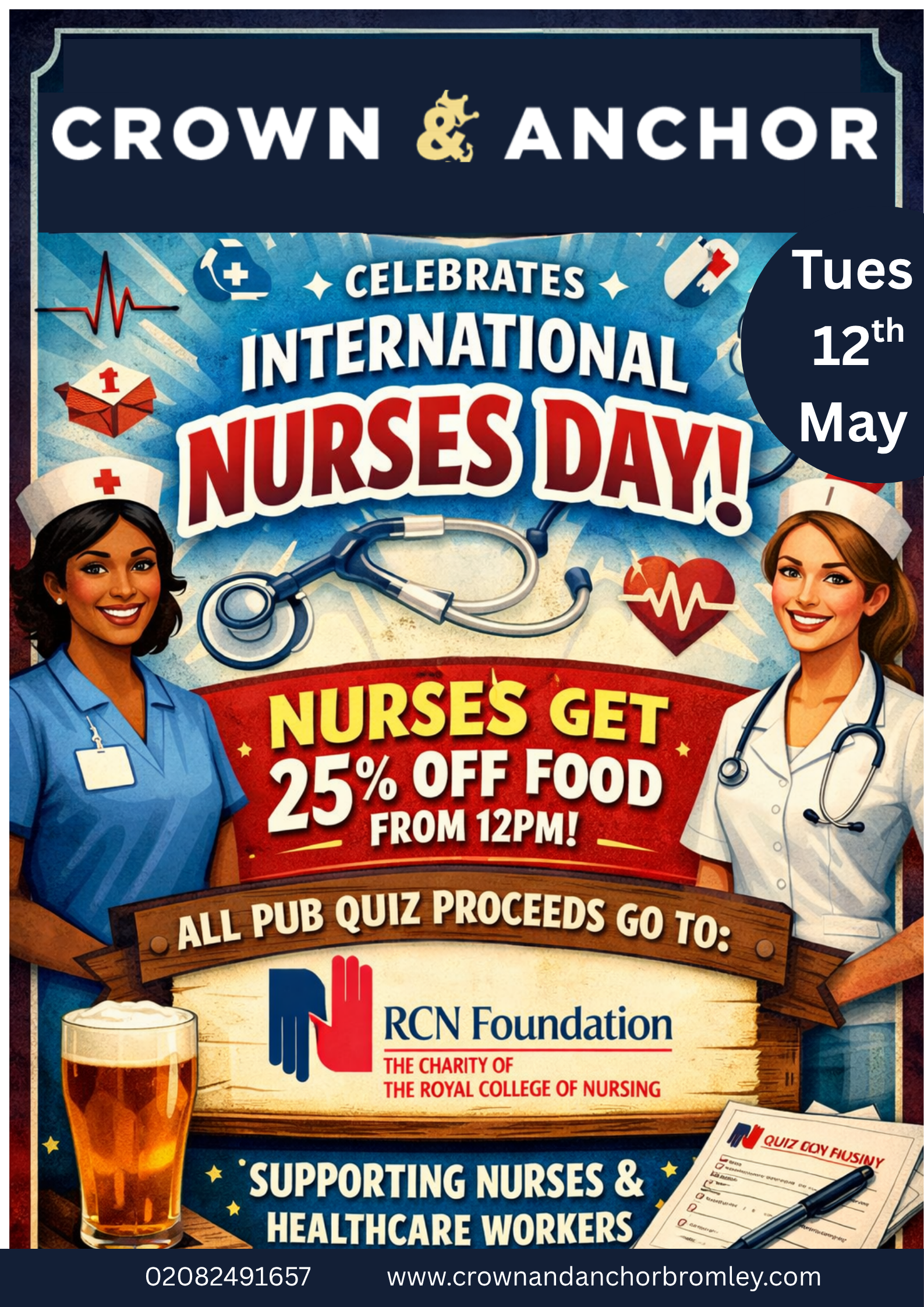 From 12pmAll Nurses enjoy 25% off food from 12pm, with proceeds from our famous pub quiz going directly to the RCN Charity!