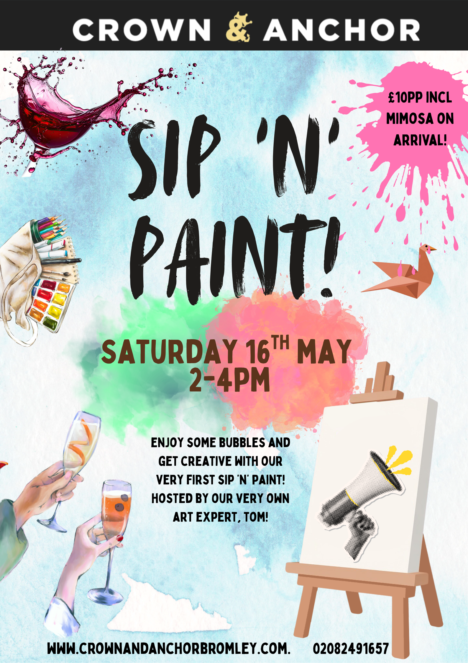 £10pp including mimosa on arrival!Join the fabulous Tom for our FIRST EVER Sip ‘n’ Paint afternoon! Get creative & tipsy for the ultimate weekend activity!